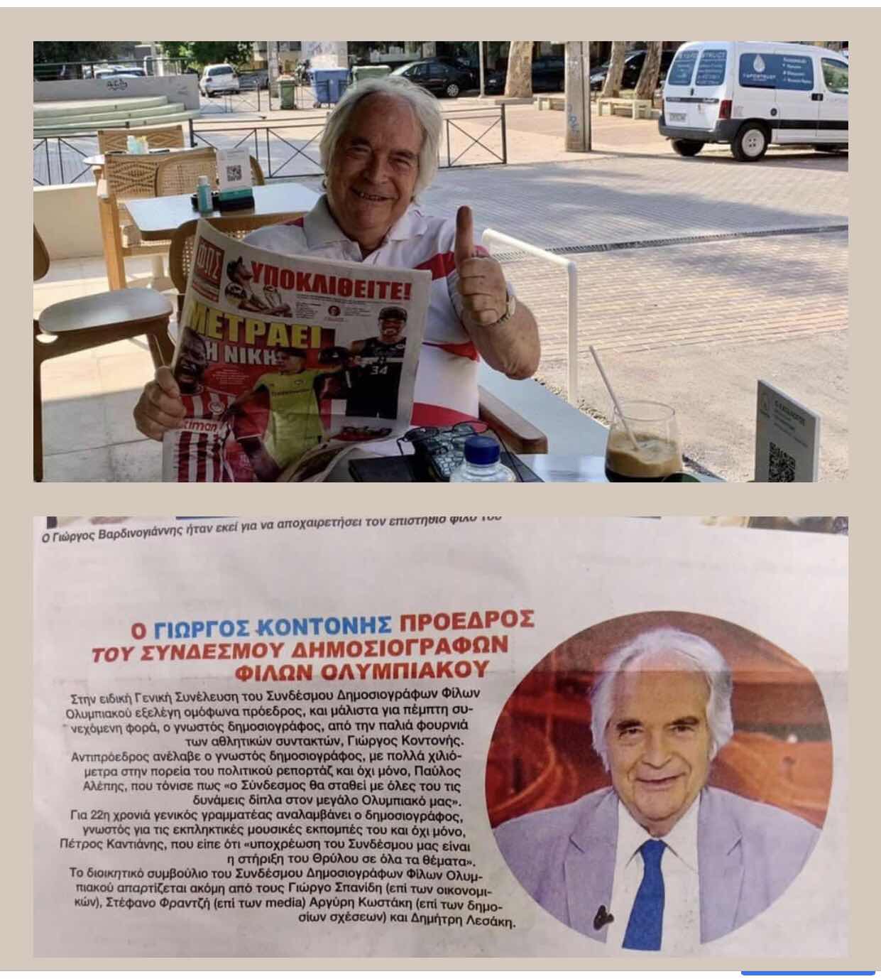 «Στην ειδική Γενική Συνέλευση του Συνδέσμου Δημοσιογράφων Φίλων Ολυμπιακού εξελέγη ομόφωνα και μάλιστα για πέμπτη συνεχόμενη φορά, ο γνωστός Δημοσιογραφος, από την παλια «φουρνιά» των αθλητικών συντακτών, Γιώργος Κοντονής, ο οποίος δήλωσε πως «στόχος και σκοπός του νέου διοικητικού συμβουλίου, είναι η σωστή προβολή του Ολυμπιακού μας στον οποίο ευχόμαστε καλή πορεία στο φετινό Τσάμπιονς Λιγκ και κατάκτηση του 47 πρωταθλήματος της Σούπερ Λίγκας»! Για τον Σύνδεσμο τόνισε οτι «προσπάθεια μας θα είναι να κάνουμε ενα ακόμη βήμα μπροστά»!