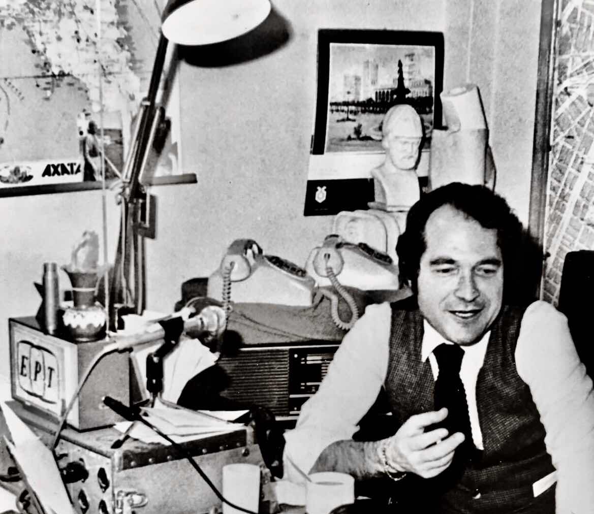 Είμαι στο ειδικό studio της δικής μας ΕΡΤ ΕΡΑ που οι τεχνικοί μας είχαν φτιάξει στα γραφεία της Τροχαίας και από το οποίο μετέδιδα την εκπομπή της Τροχαίας, που ήταν το ένθετο στο ΚΑΘΕ ΜΕΡΑ ΠΑΝΤΟΥ. Έχω μόλις τελειώσει την εκπομπή και ετοιμάζομαι να ανέβω στην Αγία Παρασκευή για τα ΧΡΟΝΙΚΑ ΤΗΣ ΗΜΕΡΑΣ την ιστορική εκπομπή που ήταν η Ραδιοφωνική Ταυτότητα του ΕΙΡ και ασφαλώς της ΕΡΤ ΕΡΑ!