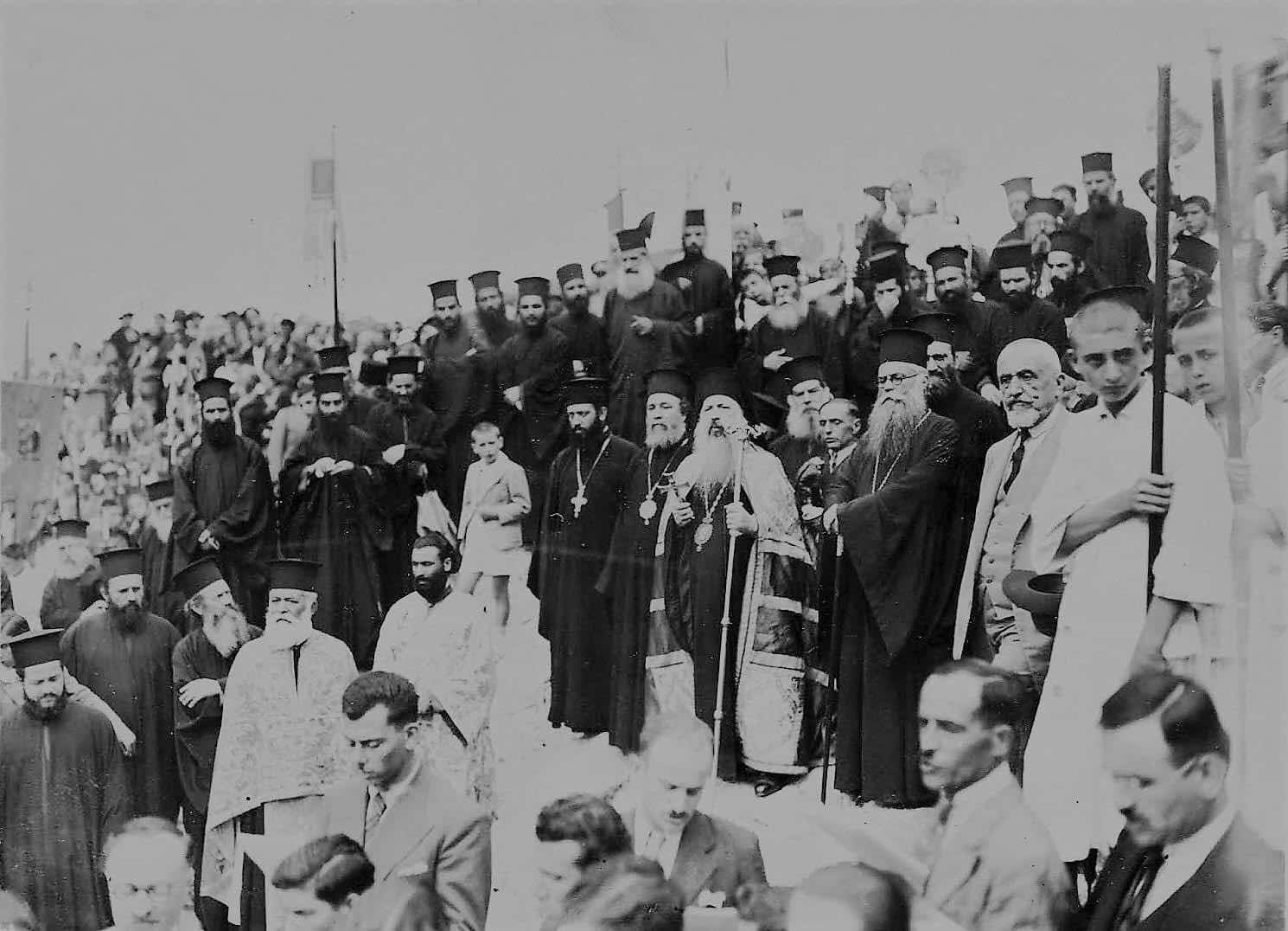 Ιερός Βράχος του Αρείου Πάγου : Ο Αρχιεπίσκοπος Αθηνών Χρυσόστομος Παπαδόπουλος κατά τον Εσπερινό του έτους 1936,στις 29 Ιουνίου. Δίπλα στον τότε Αρχιεπίσκοπο Χρυσόστομο αριστερά,, ο Επίσκοπος Χριστουπόλεως Ιάκωβος Βαβανάτσος, μετέπειτα Μητροπολίτης Αττικής και Μεγαρίδος και στη συνέχεια Αρχιεπίσκοπος Αθηνών και δεξιά ο Μητροπολίτης Αλεξανδρουπόλεως Ιωακείμ. Διακρίνονται επίσης οι αείμνηστοι Χρυσόστομος Δασκαλάκης, Ηγούμενος τότε της Μονής Πεντέλης και μ. τ. Μητροπολίτης Μεσσηνίας και Χρυσόστομος Παπασαραντόπουλος ο Ιεραπόστολος. καθ'ως και ο Τίτος Ματθαιάκης μ. τ. Μητροπολίτης Παραμυθίας. Ήδη από το 1925 είχε θεσπίσει ο αείμνηστος Αρχιεπίσκοπος Χρυσόστομος Παπαδόπουλος (1923-1938) την τέλεση Πανηγυρικού Εσπερινού επί του ιερού βράχου του Αρείου Πάγου κατά την εορτή των Αποστόλων Πέτρου και Παύλου, συνέθεσε μάλιστα ο ίδιος και ειδικό Απολυτίκιο για τον Απόστολο Παύλο, "Εθνών σε κήρυκα και φωστήρα τρισμέγιστον..." .Τους πρώτους ανεπίσημους Εσπερινούς επί του ιερού βράχου είχαν ξεκινήσει οι μακαριστοί πατέρες Άγγελος Νησιώτης και Μάρκος Τσακτάνης. Στους εσπερινούς αυτούς μετείχε, σύμφωνα με μαρτυρία του π. Αγγέλου Νησιώτη ο ποιητής Κωστής Παλαμάς που ήταν ένας από τους ένθερμους εισηγητές πρός τον Αρχιεπίσκοπο για την θέσπιση του επίσημου υπαίθριου Εσπερινού που τελείται μέχρι σήμερα.
